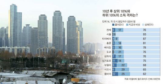 이 조사는 한국뿐 아니라 중국·대만·일본·호주 등 아시아 8개국의 10개 도시 거주자 5000여 명을 상대로 이뤄졌다. 소득 격차가 커질 것이라는 한국의 응답률 93%는 전체 평균 76%보다 월등히 높았고 10개 도시 중에서도 최고였다. 한국에 이어 대만(타이베이)이 87%로 높았다.