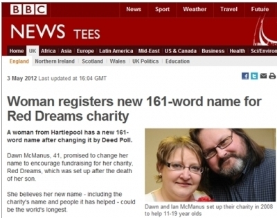 영국의 돈 맥마너스(Dawn McManus)라는 여성은 아들의 죽음 이후 설립한 ‘레드 드림(Red Dreams)’이라는 자선단체의 기금 모금을 독려하기 위해 최근 161자라는 엄청난 길이의 이름으로 개명한 것으로 전해졌다.