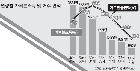 소득 감소와 연금 부족에 시달리는 고령자들은 기존의 주택을 처분하고 작은 집으로 옮겨가고 있다. 연령별 거주면적을 보면 50~60대 가구는 평균 80㎡ 크기의 집에 살지만, 이후 연령대가 높아질수록 집 크기는 축소되는 추세를 보인다. 80세 이상 고령가구의 거주면적은 63.6㎡로 50~60대에 비해 20% 이상 작은 것으로 나타났다.