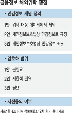 민감정보의 개념에 대해 “민감정보를 확대할 경우 (유럽)금융회사의 부담이 될 소지가 있어 민감정보 범위는 최소화로 정하는 것이 바람직하다”는 안과 “개인정보호호법 이외의 민감정보(생체정보 등)도 포함해야 한다”는 안이 맞서고 있다. 또 근본적으로는 민감정보를 FTA에 따른 위탁 대상 데이터에서 제외할지 여부도 쟁점이 되고 있다.
