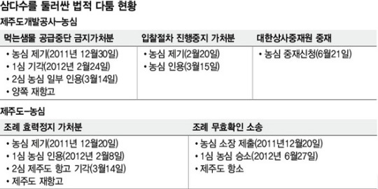 농심은 1998년부터 14년 넘게 삼다수를 도외에 유통·판매하면서 제주도개발공사와 밀월 관계를 이어왔다. 하지만 농심 쪽이 독점적 계약을 통해 과도한 수익을 올린다는 여론 탓에 분쟁에 휩싸였다. 제주도 쪽과 농심 사이에 진행되는 법적 다툼은 모두 5건에 이른다. 삼다수의 유통 권한을 결정할 핵심 사안인 ‘먹는샘물 공급중단 금지 가처분’ 소송의 1심에서는 제주도개발공사가 이겼다. 하지만 지난 6일 2심인 광주고법은 “대한상사중재원의 중재 판정 또는 12월14일 중 먼저 도래하는 날까지 공급을 중단하면 안 된다”고 결정했다. 이에 따라 애초 지난 3월14일에 공급을 끊어도 된다는 판단이 12월14일까지 미뤄진 상태다. 양쪽 모두 법원 결정에 항고한 상태다.