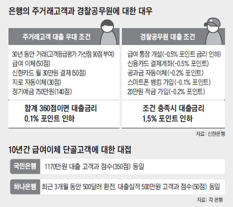 신한은행은 최근 경찰공무원을 대상으로 한 특별 대출상품(참수리사랑대출)을 선보였다. 신한은행이 제시하는 금리 우대 내용은 파격적이다. 급여통장을 신한은행으로 바꾸면 0.5%포인트, 신용카드 대금 결제 계좌로 지정하면 0.5%포인트, 공과금을 자동 이체하면 0.2%포인트, 스마트폰 뱅킹에 가입하면 0.1%포인트, 20만원 이상 적금에 가입하면 0.2%포인트 추가로 깎아 준다. 조건만 맞으면 최대 1.5%포인트 이자를 줄일 수 있는 셈이다. 경찰공무원이 신한은행의 새 고객이 되면 1000만원 대출을 받았을 때 연(年) 15만원 이자 부담을 덜 수 있다는 얘기다.